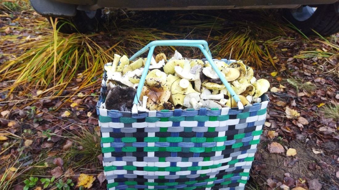 Корзина быстро тяжелеет от подзеленок и зеленок. С восьми утра за четыре с половиной часа в один нож удалось насобирать около 25 литров грибов — считай, два с половиной ведра.
