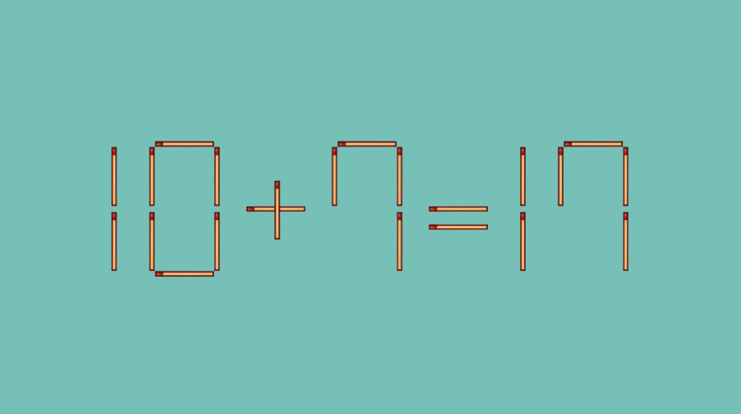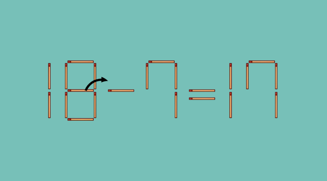 Переставляем одну спичку с восьмёрки (8) на знак минуса (−), превращая его в плюс (+). Получаем правильное равенство: 10 + 7 = 17.