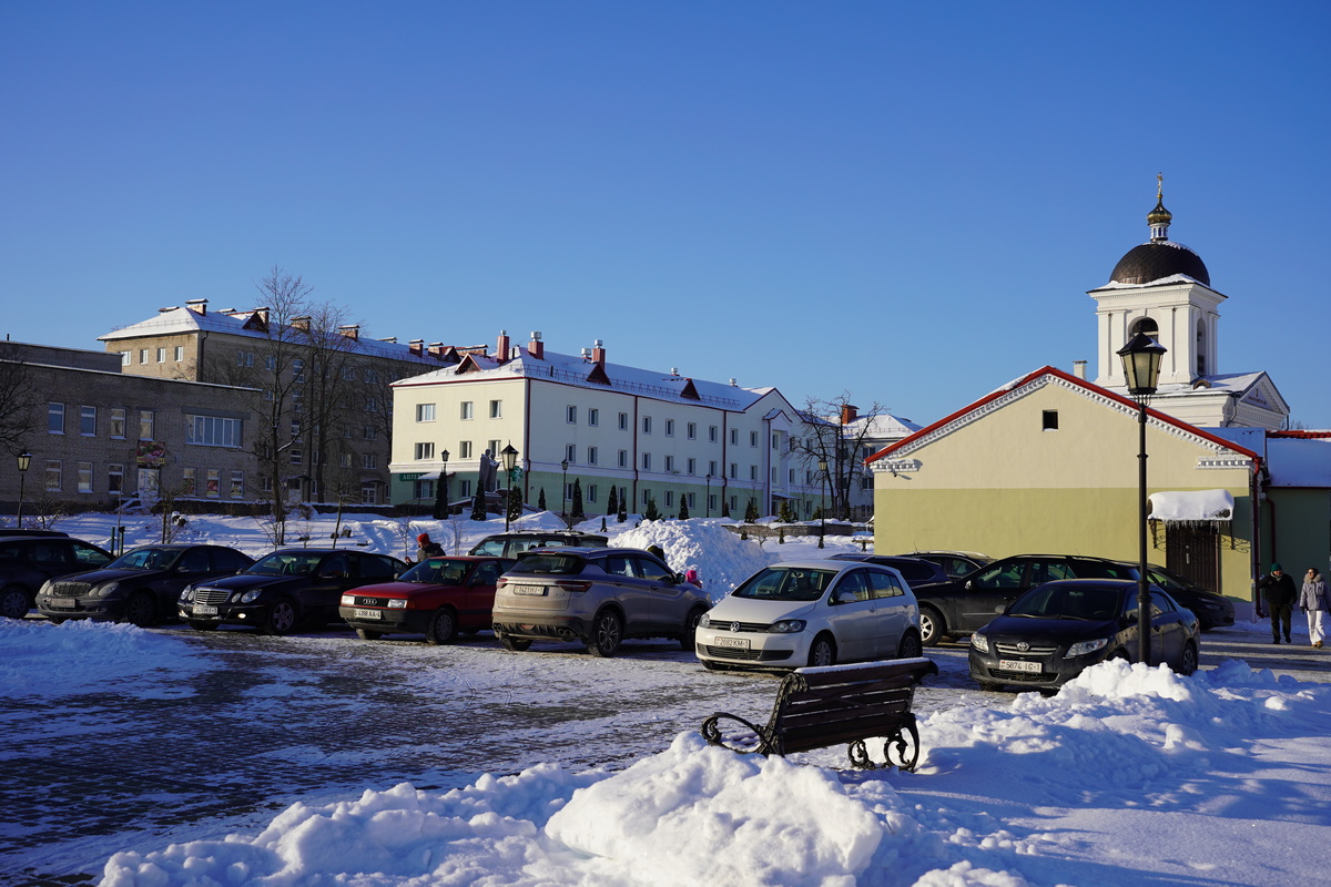 Основные стоянки быстро заполнились, поэтому напротив Успенского собора открыли дополнительную парковку. Машины с номерами из всех регионов Беларуси продолжают прибывать.