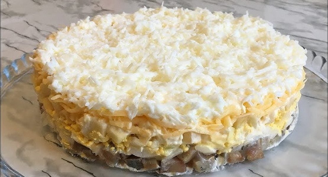 Следующий слой — измельчённые яйца и немного майонеза. Завершите всё тёртым сыром — именно он создаёт эффект «снежной шапки».