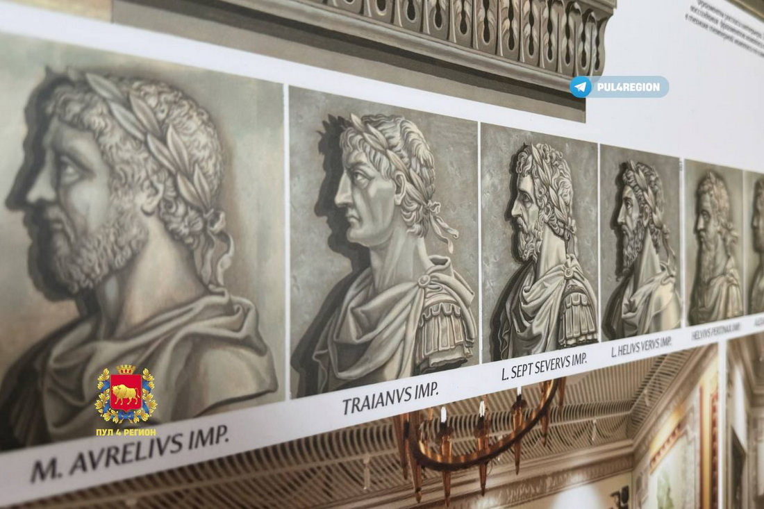 Живопись того времени обнаружили сразу в нескольких залах — шестом, пейзажном и зале императорских портретов. Все они сегодня находятся в активной фазе реставрации: мастера восстанавливают не только настенную живопись, но и парадную лестницу.