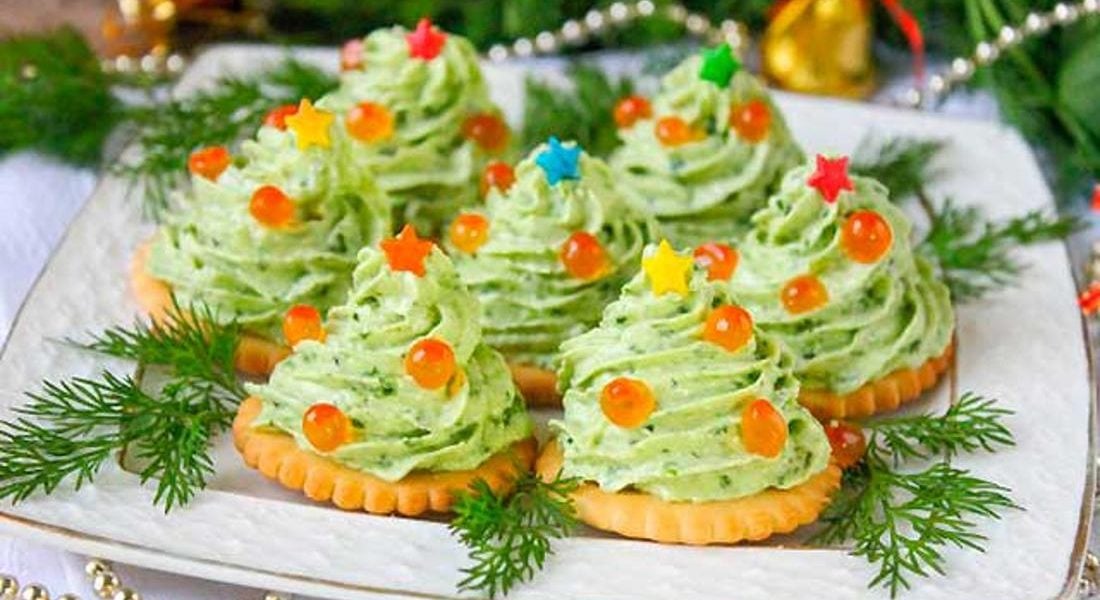 Разложите крекеры на тарелке и выдавите сверху шпинатную массу, формируя мини-ёлочки.