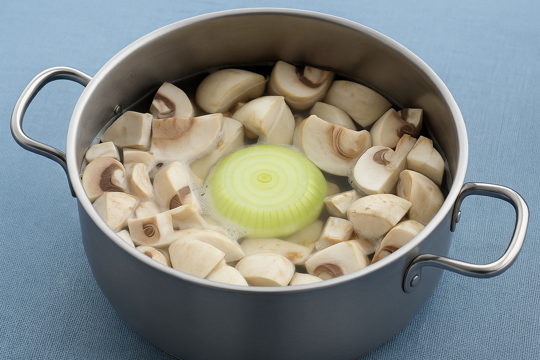 Перед тем как варить собранные грибы, тщательно промойте их и залейте водой. В кастрюлю добавьте целую очищенную луковицу.