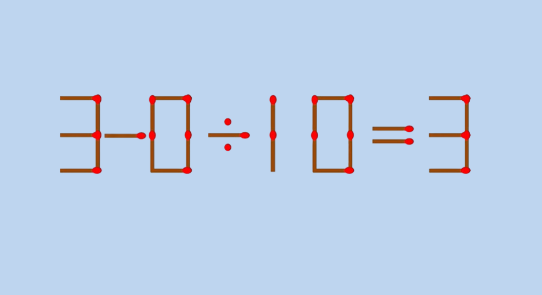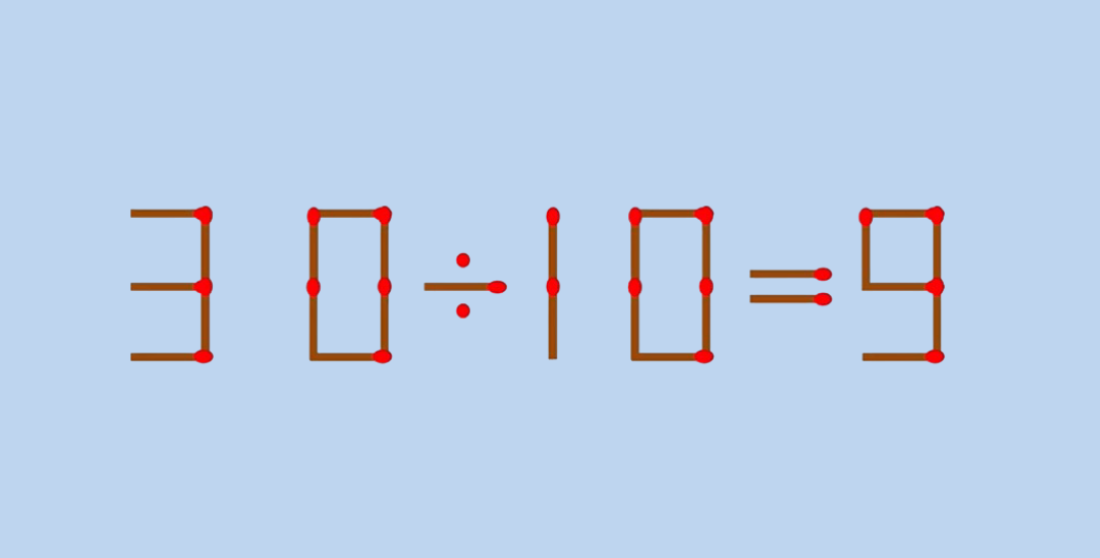Посмотрите на изображение: здесь допущена ошибка в уравнении «30:10=9». Ваша цель — переместить всего одну спичку так, чтобы выражение стало верным. Сделать это нужно быстро — всего за 25 секунд. Справитесь?