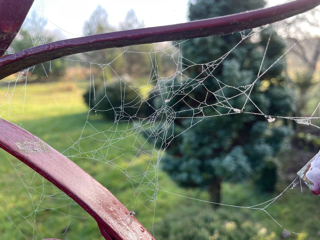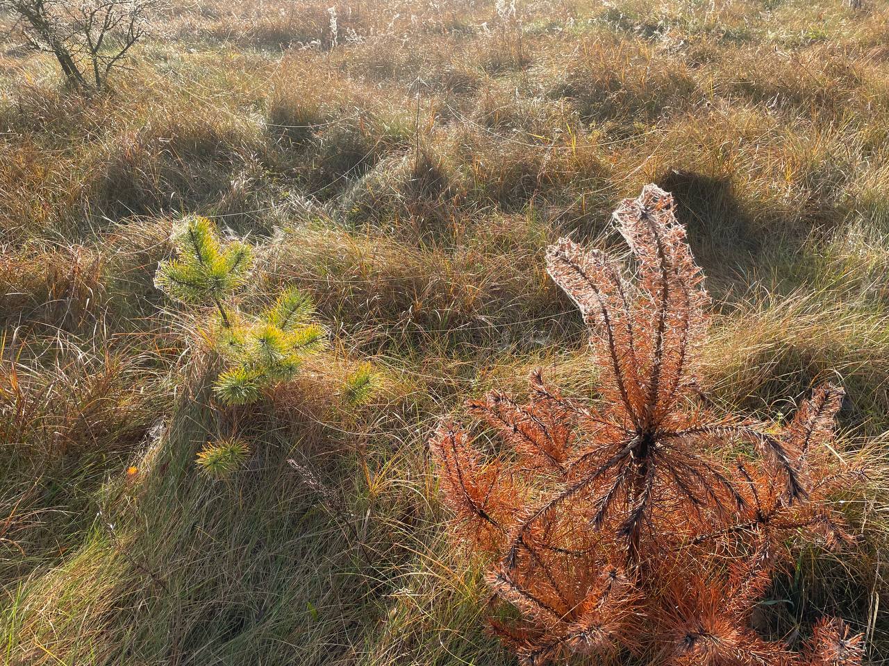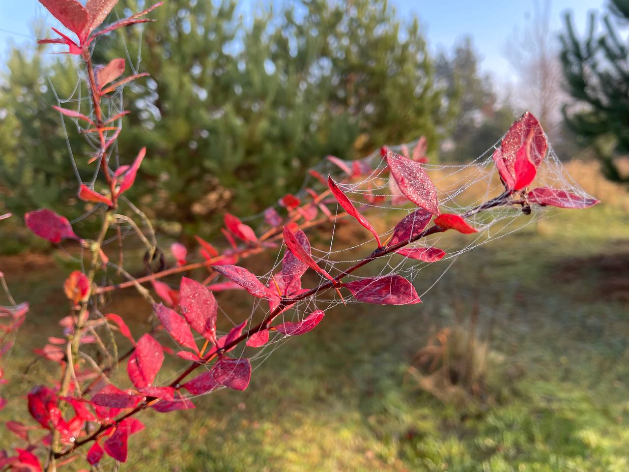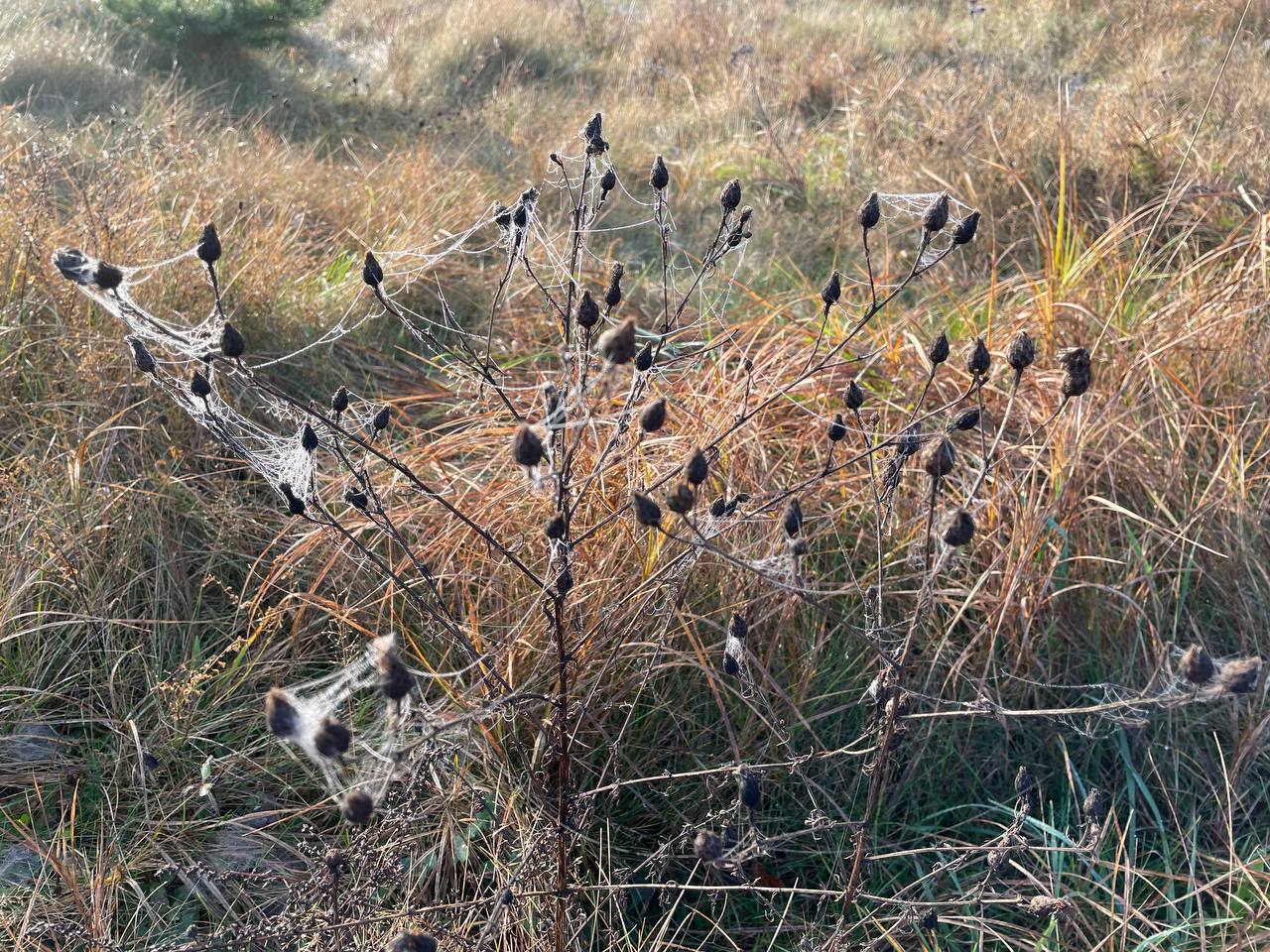 Каждое растение словно украсилось драгоценностью — каждая травинка, каждое дерево оплетено тонкими серебристыми нитями паутины, сверкающими в лучах солнца и капельках утренней росы. Длинные нити паутины соединяют собой тонкие стебли растений, создавая неповторимую картину осеннего пейзажа.
