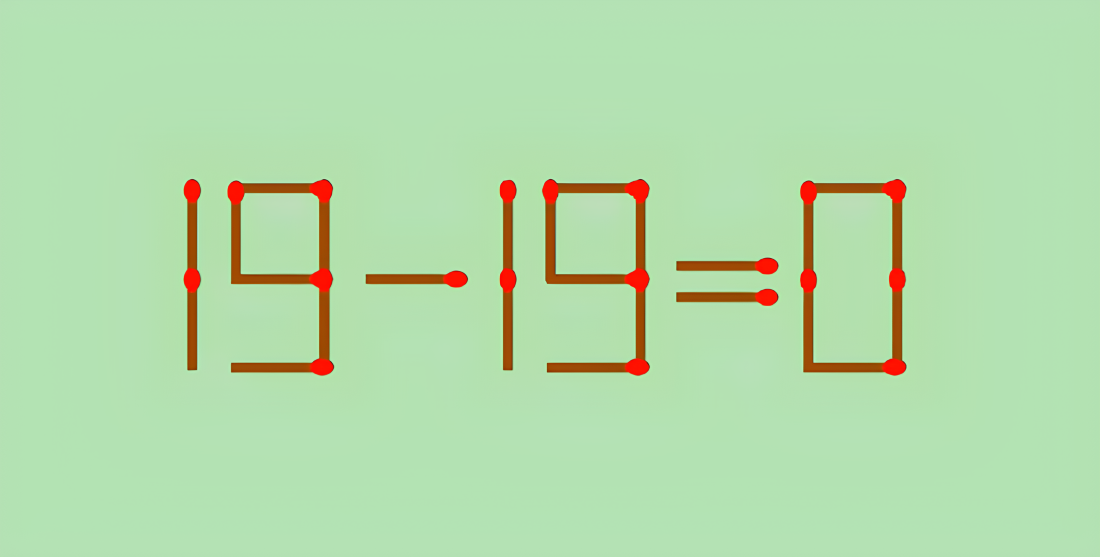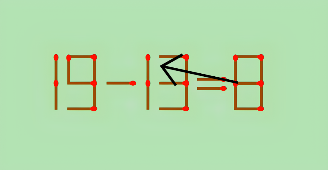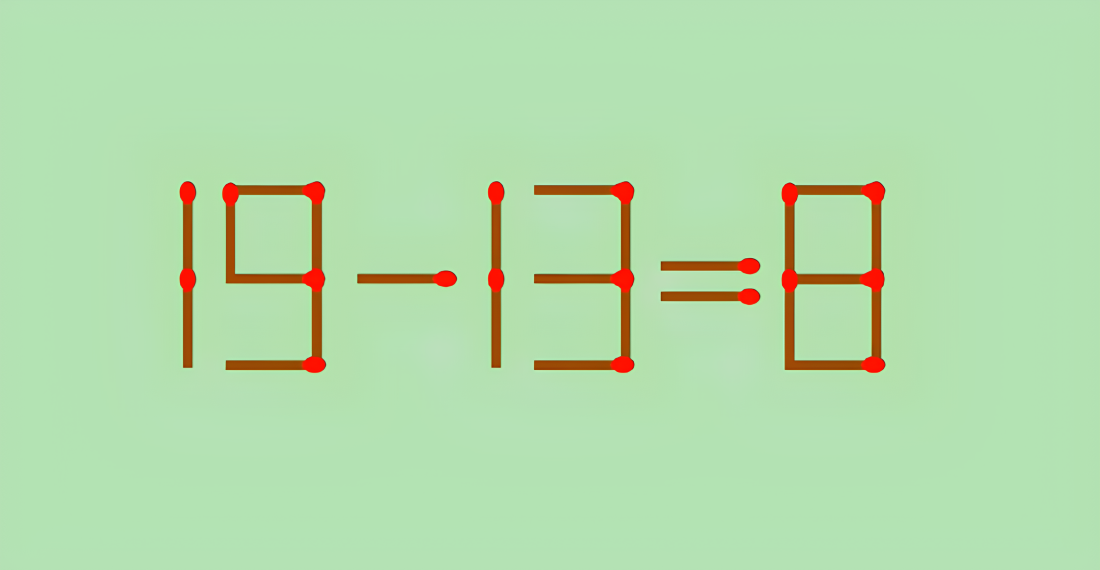 Перед вами неравенство 19−13=8. Оно очевидно неверно. Но мы можем исправить ситуацию всего одним движением руки — нужно переместить одну-единственную спичку так, чтобы получилось правильное равенство.