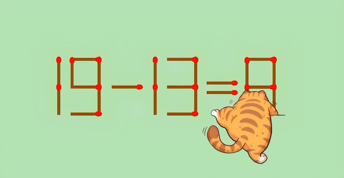 Перед вами неравенство 19−13=8. Оно очевидно неверно. Но мы можем исправить ситуацию всего одним движением руки — нужно переместить одну-единственную спичку так, чтобы получилось правильное равенство.