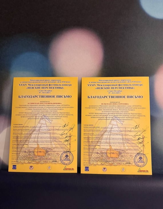 Руководитель коллектива Елена Сергеевна Бельская и балетмейстер Анастасия Вадимовна Кучинская удостоены Благодарственных писем жюри и организаторов фестиваля за высокий профессионализм и вклад в развитие хореографического искусства.