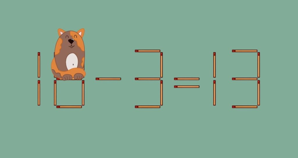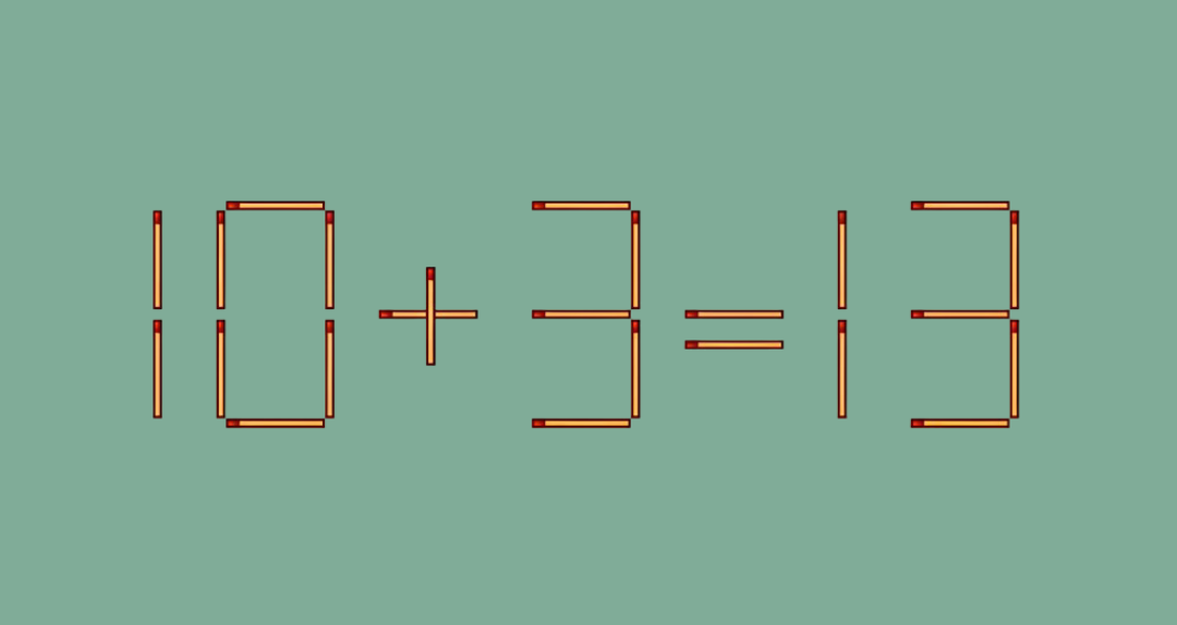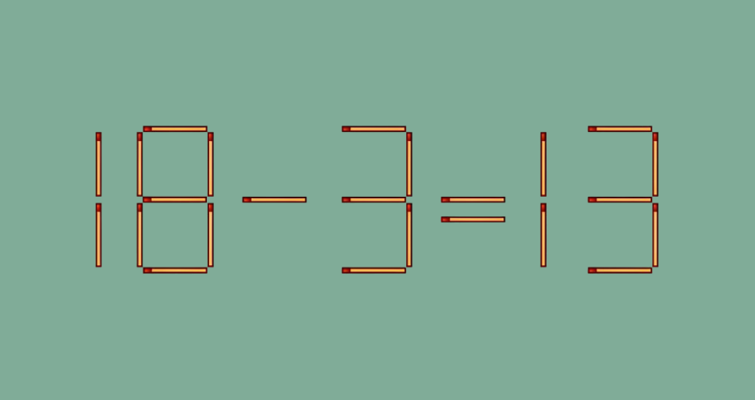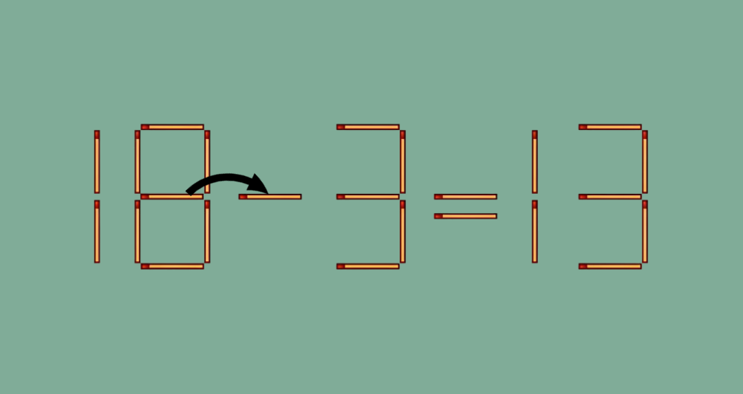 Перед вами уравнение: 18−3=13. Ваша цель — исправив его всего одним движением, превратить неверное равенство в верное. Для этого нужно переместить всего одну спичку (не забудьте зафиксировать время).