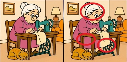 Перед вами две, на первый взгляд, одинаковые картинки: бабушки работают за швейной машинкой. Кажется, что рисунки полностью идентичны? Не спешите делать выводы — художник спрятал три маленьких, но настоящих отличия.
