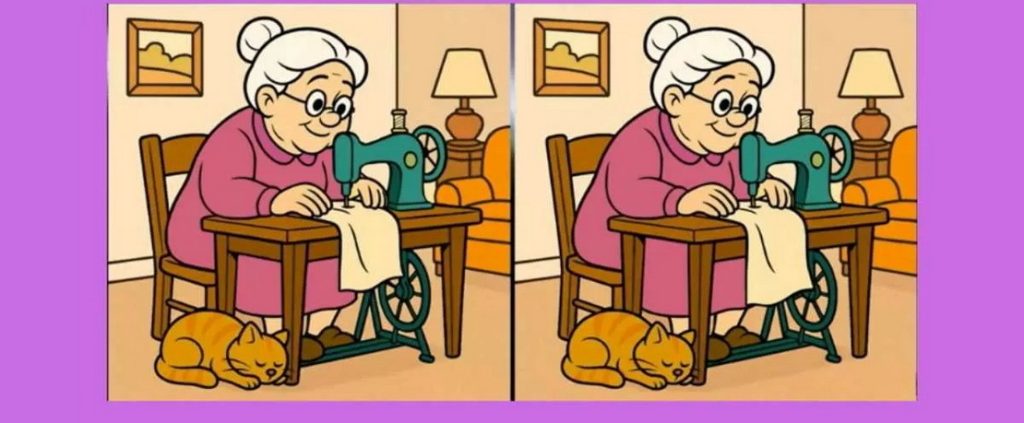 Перед вами две, на первый взгляд, одинаковые картинки: бабушки работают за швейной машинкой. Кажется, что рисунки полностью идентичны? Не спешите делать выводы — художник спрятал три маленьких, но настоящих отличия.