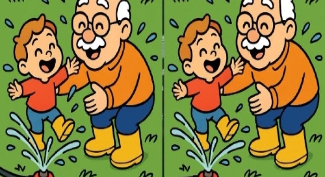 Готовы проверить свою наблюдательность? Посмотрите на две картинки с дедушкой, играющим с внуком под лейкой. На первый взгляд они полностью идентичны, но на самом деле между ними есть три отличия. Ваша задача — найти их за 45 секунд. Справитесь?
