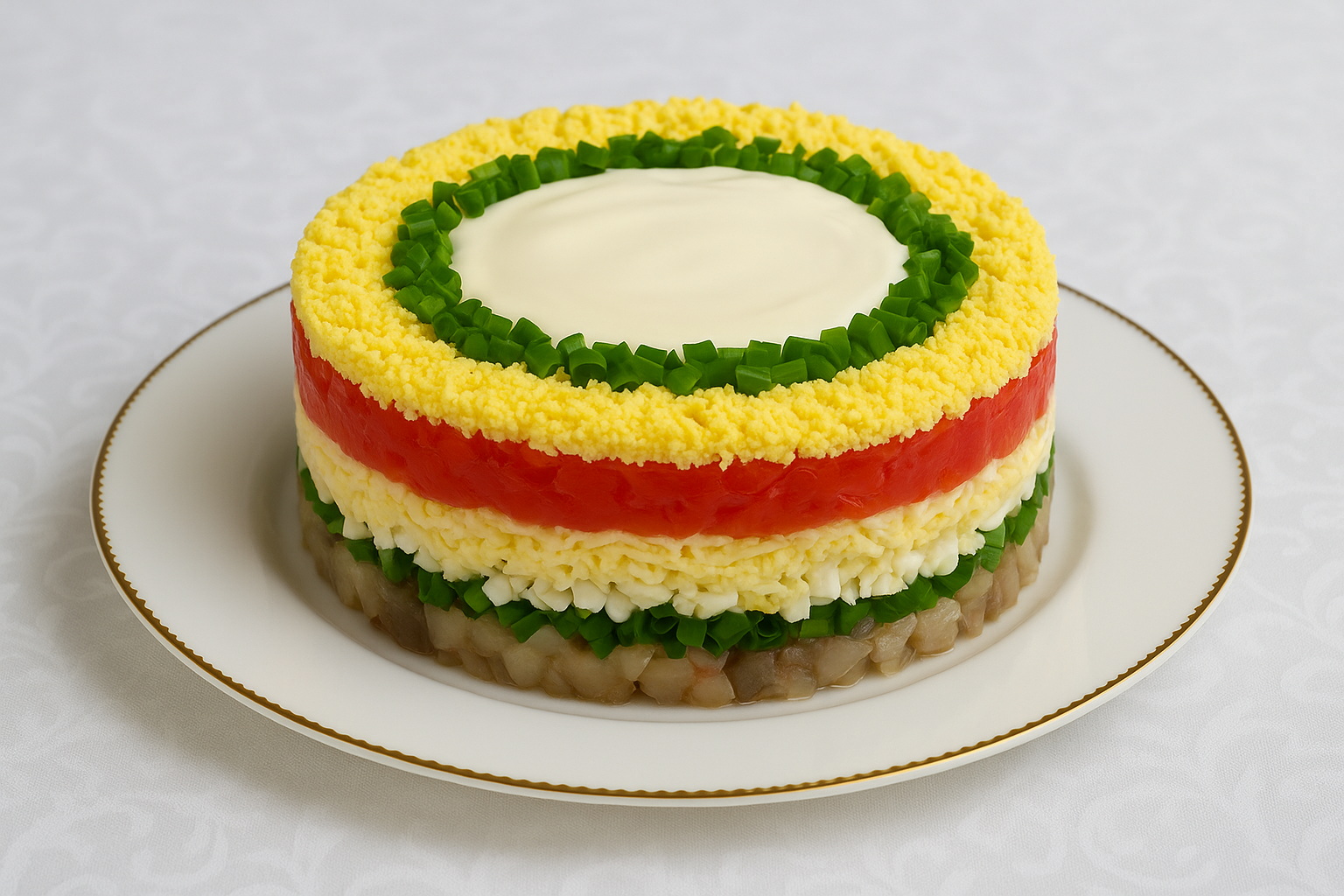 Следующий слой — мелко нарезанные яйца. Снова добавьте тонкую сеточку майонеза.