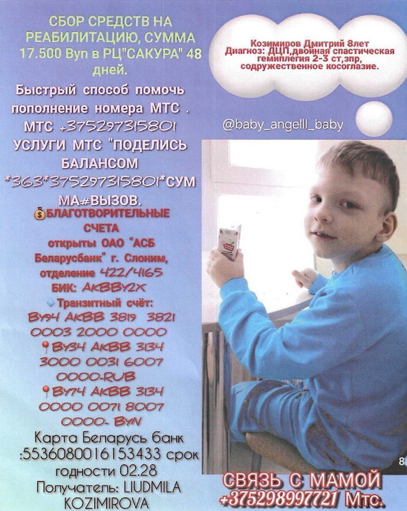 В Слониме многодетная семья Людмилы и Юрия собирает средства на очередной курс реабилитации для 8-летнего Димы, которому 8 декабря исполнится 9 лет. Мальчик родился здоровым, но в девять месяцев перенёс микроинсульт — была парализована левая сторона тела, позже поставили диагноз ДЦП.