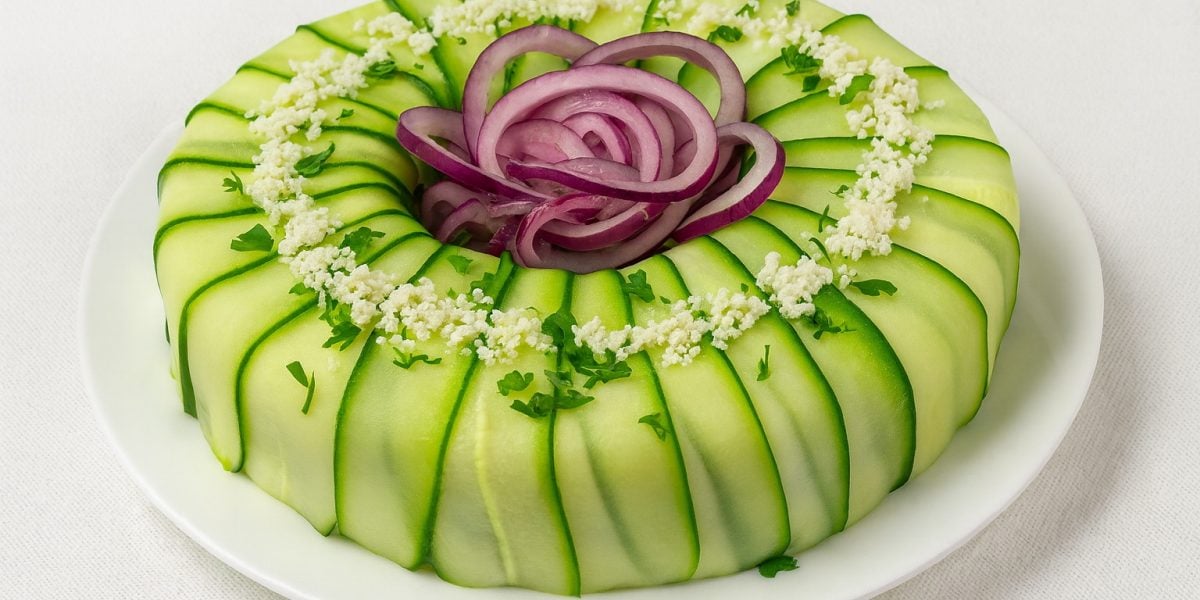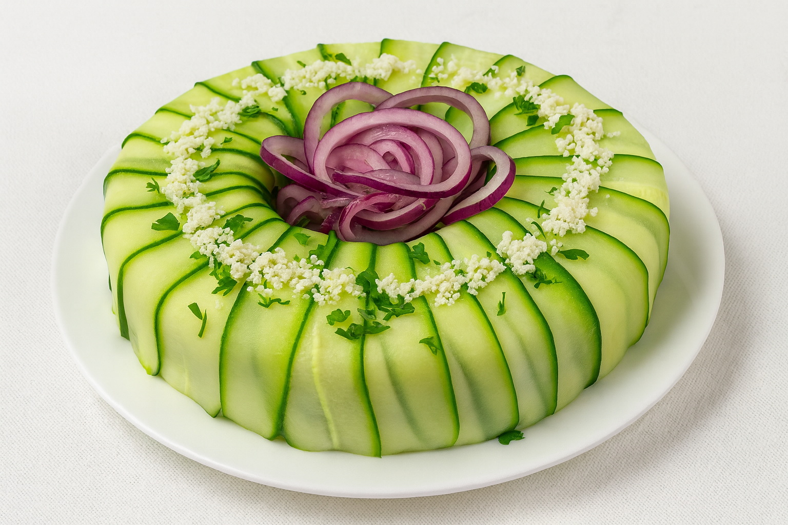 Аккуратно вынуть стакан, накрыть верх огуречными пластами, а в центр выложить маринованный красный лук.