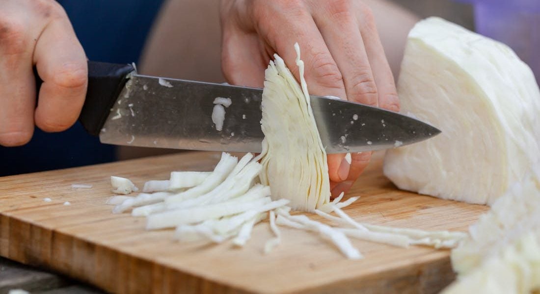 Разрежьте кочан капусты пополам, а затем на четвертинки. Положите четверть кочана на разделочную доску, возьмите овощечистку и проведите ею по внутренней стороне кочана. Капуста будет нашинкована равномерно и тонко.