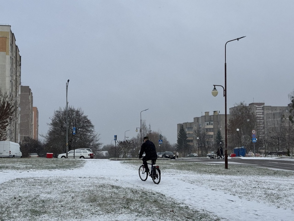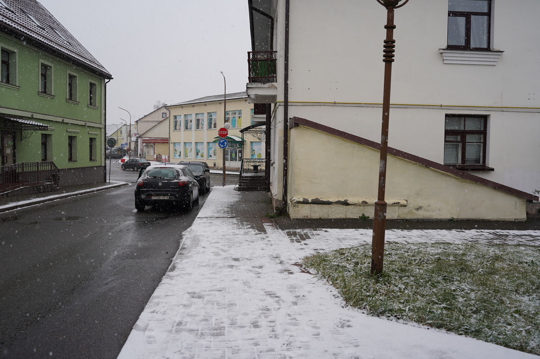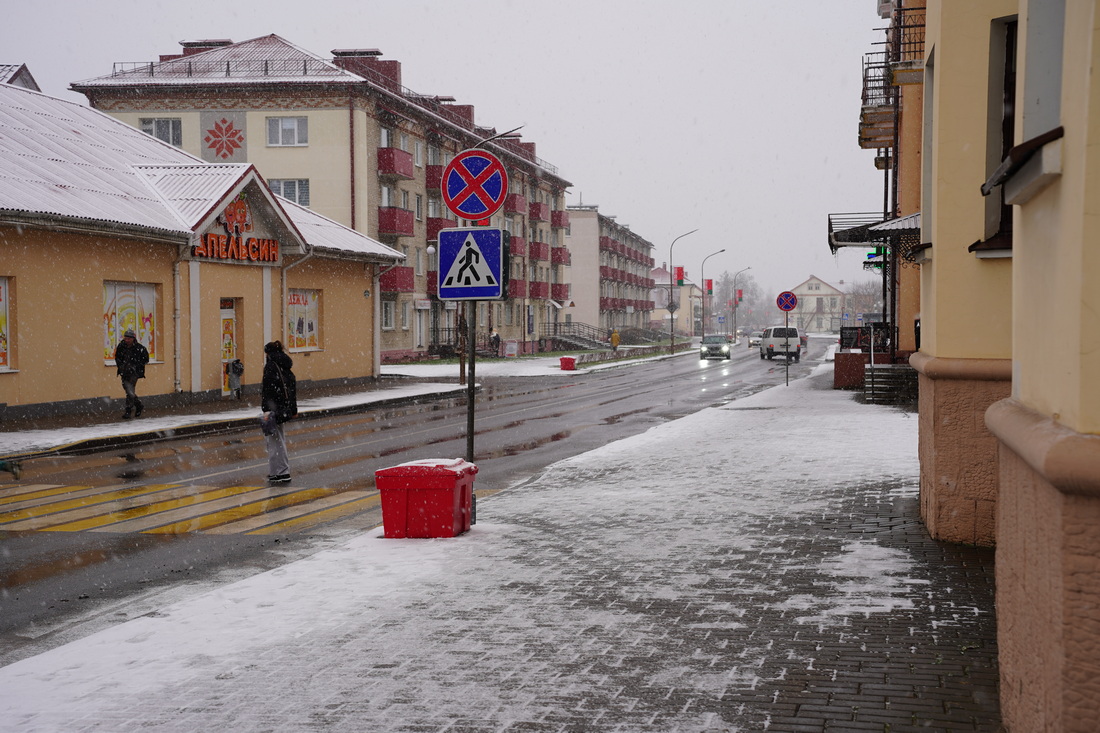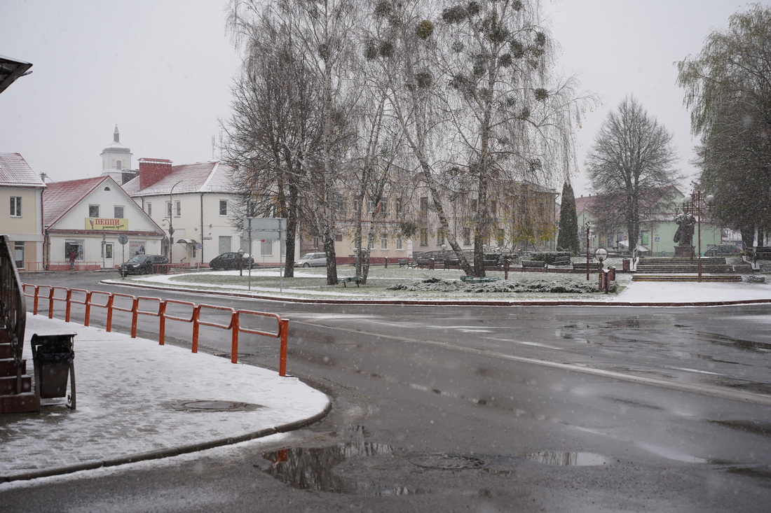 Воскресенье встретило слонимчан свежестью и снежными хлопьями. Еще накануне горожане ходили в осенних куртках, а сегодня город полностью изменился — белый снег покрыл дворы, парки и улицы.