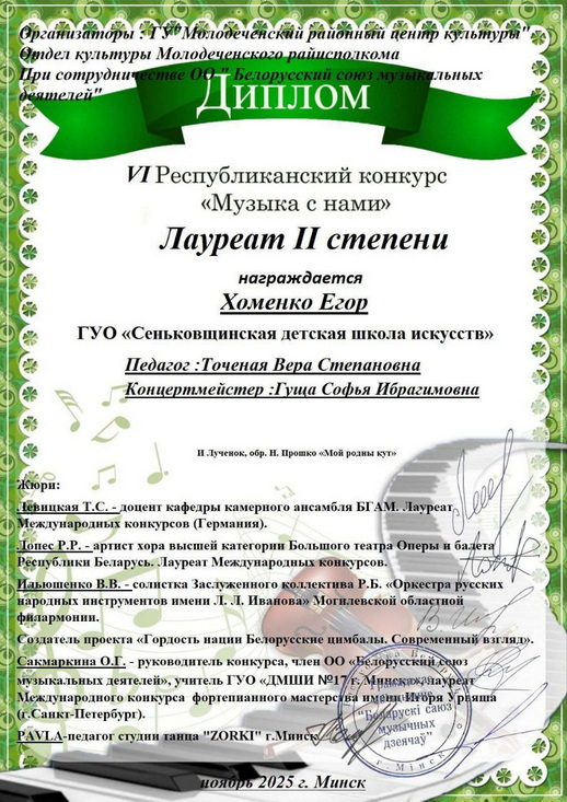 Номинация «Инструментальное исполнительство. Цимбалы» Егор Хоменко (преподаватель — Точёная В.С., концертмейстер — Гуща С.И.) завоевал Диплом лауреата II степени.
