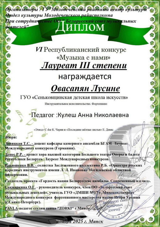 Номинация «Инструментальное исполнительство. Фортепиано» Лусине Овасапян (преподаватель — Кулеш А.Н.) стала обладателем Диплома лауреата III степени.