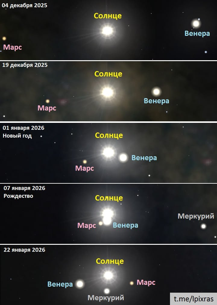к 19 декабря Венера и Марс сблизятся с Солнцем до 5–6°;