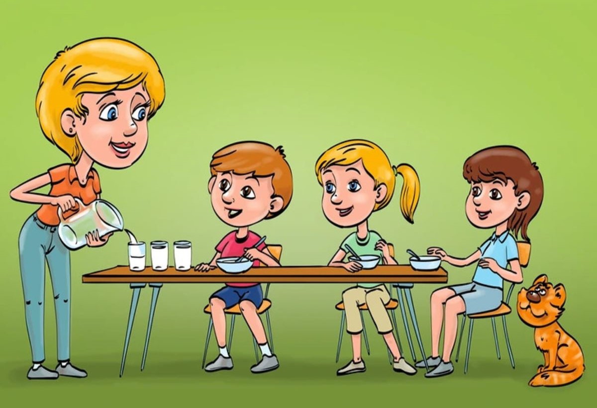 На изображении представлены трое ребятишек, которые едят за столом. Перед каждым ребёнком стоит тарелка с кашей. Мама всем троим заботливо наполняет стаканы молоком из стеклянного графина. Недалеко от стола уютно устроился пушистый рыжий котёнок, внимательно наблюдая за происходящим и явно мечтающий отведать лакомства.