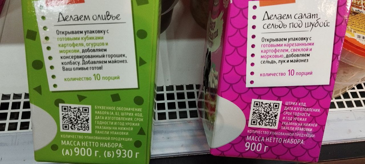 Наборы рассчитаны на тех, кто ценит время и предпочитает готовые решения. Внутри — отварные и нарезанные овощи в герметичной упаковке. При этом продукты животного происхождения в состав не входят, поэтому колбасу, яйца, зелёный горошек или сельдь необходимо докупить отдельно.