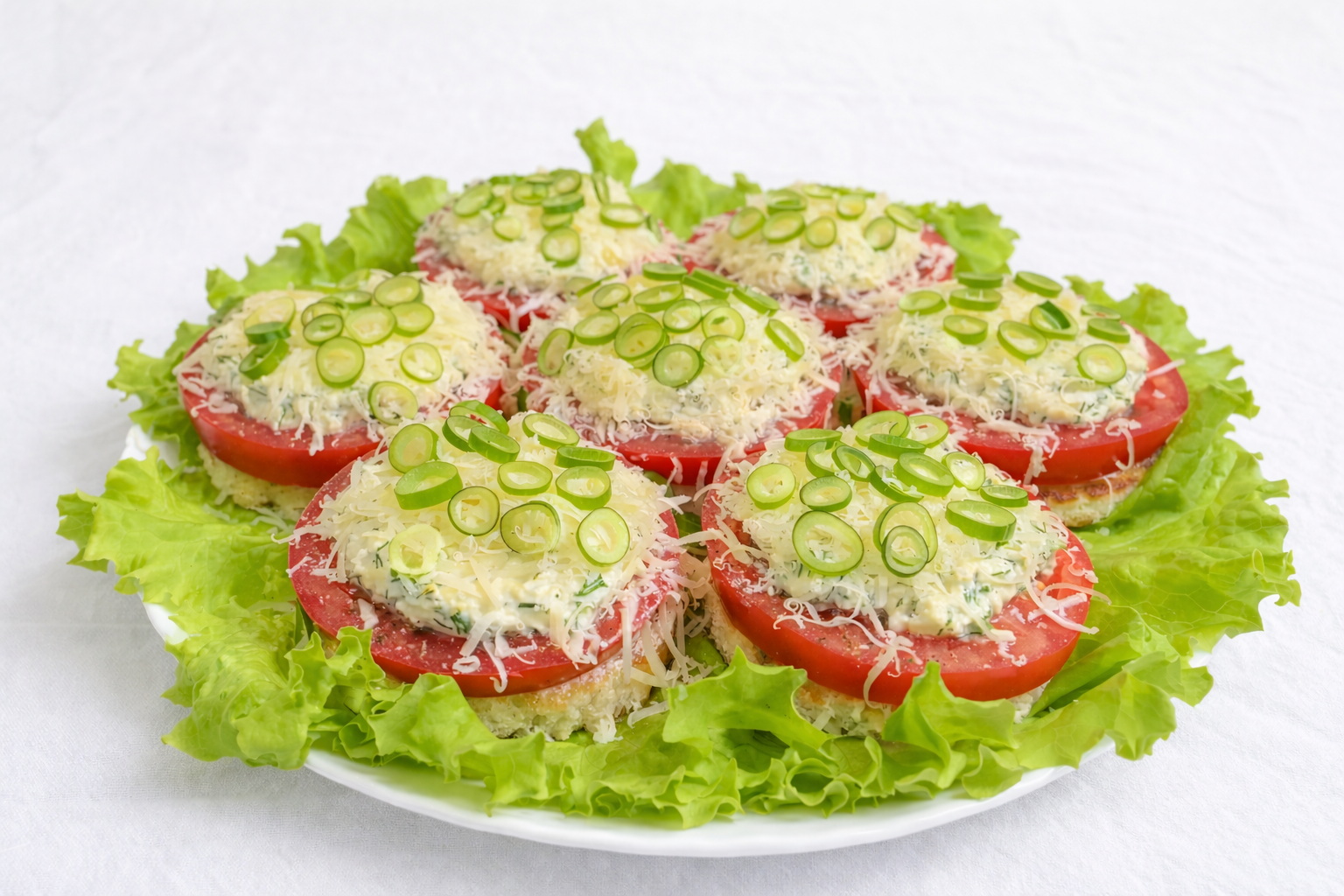 Намажьте ломтики тонким слоем сливочного сыра. Помидоры нарежьте кружочками и выложите сверху.