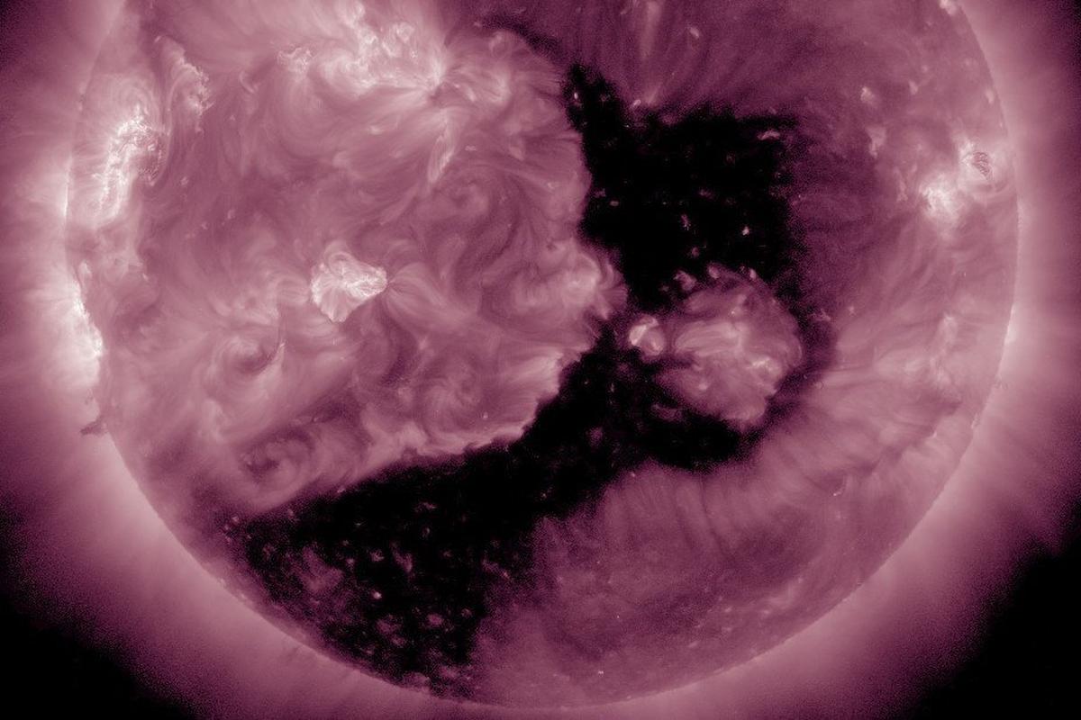 Лаборатория солнечной астрономии ИКИ РАН сообщает, что воздействие на магнитное поле Земли началось раньше прогнозов. В окрестностях планеты уже фиксируются признаки влияния потока возмущённого солнечного ветра, исходящего из крупной корональной дыры на Солнце. Она сейчас расположена почти в центре солнечного диска и охватывает значительную часть южного полушария и область ближе к экватору. Ночью была зарегистрирована кратковременная магнитная буря уровня G1.