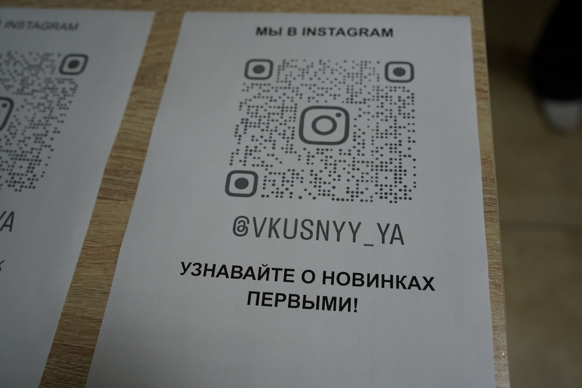 У магазина есть страница в Instagram, где публикуют новинки, акции и сладкие предложения. Подписывайтесь, чтобы узнавать обо всём первыми: @vkusnyy_ya — отсканируйте QR-код прямо в магазине и переходите в профиль.