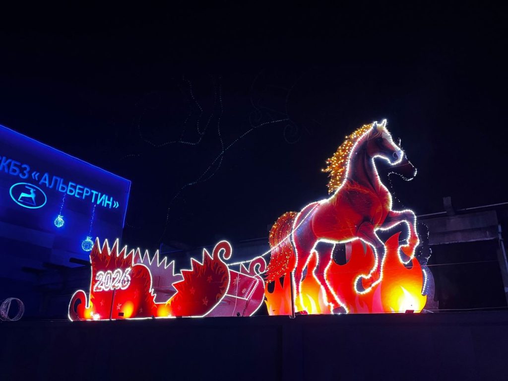 Помимо традиционных ёлочек, шаров и гирлянд, в этом году появились новые арт-объекты в виде больших рождественских саней с символом наступающего 2026 года Огненной лошадью и огромного сверкающего фонтана.