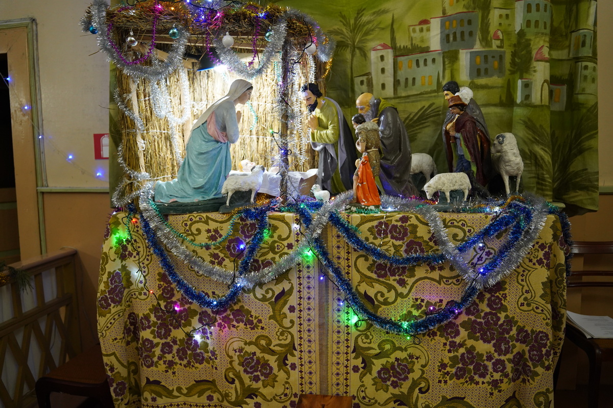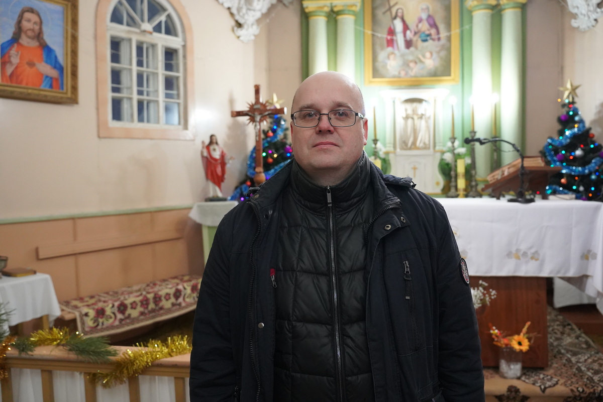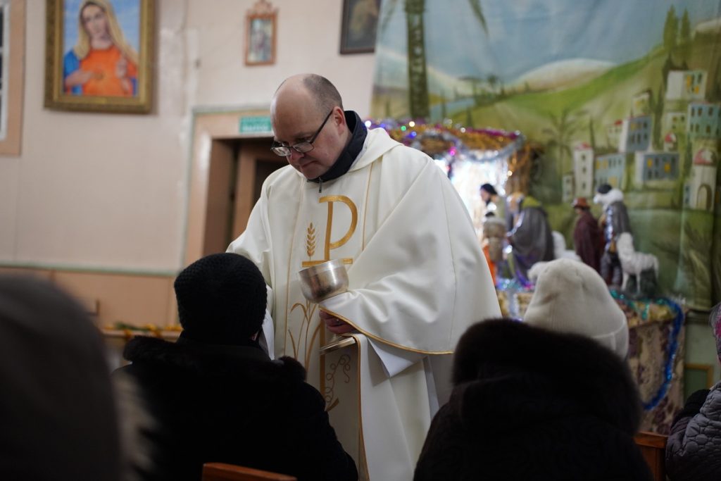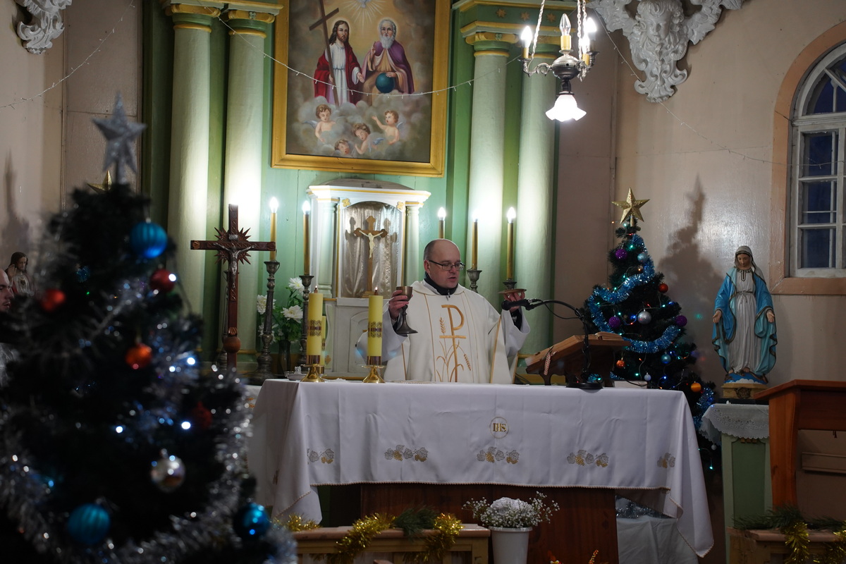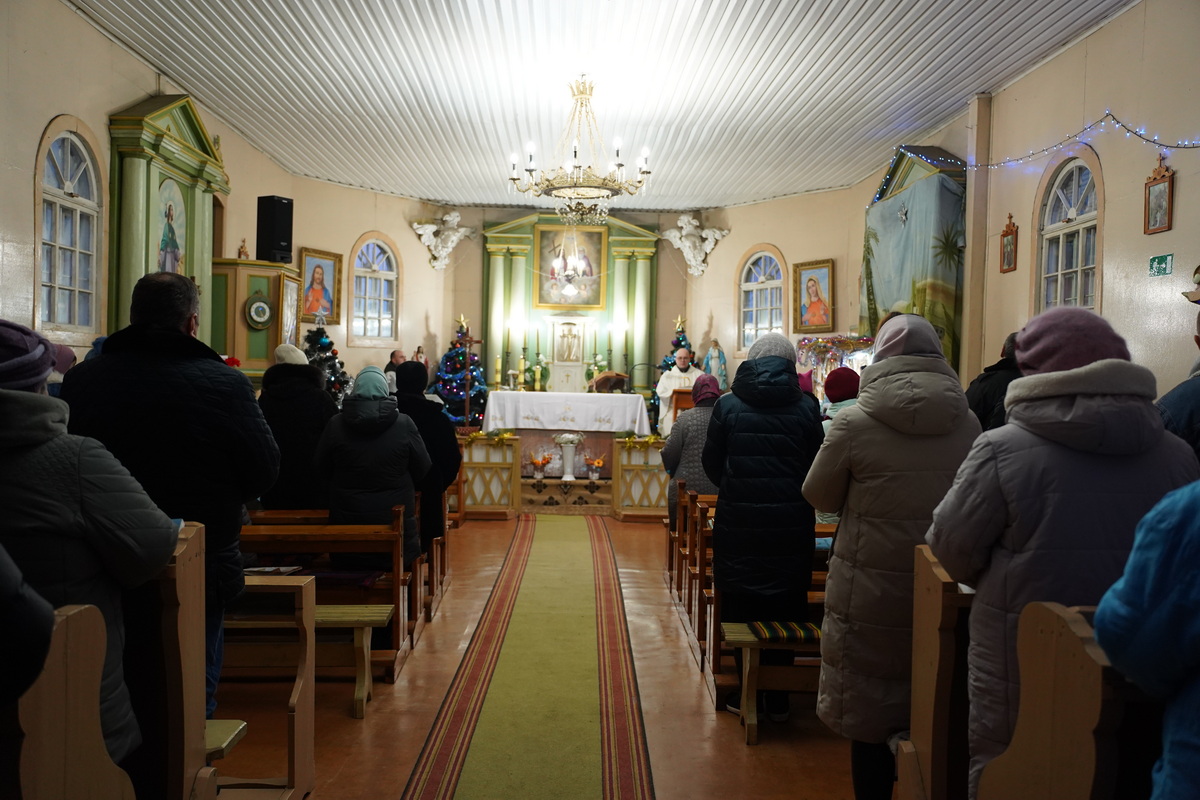 Касцёл быў святочна аздоблены да Божага Нараджэння: ёлкі з агеньчыкамі, батлейка са Святой Сям’ёй, гірлянды і калядны дэкор стварылі адчуванне хатняй цеплыні і духоўнага свята.
