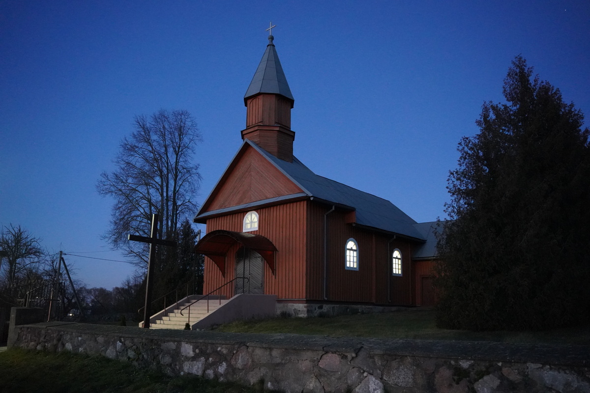 Пад вячэрнім небам драўляны касцёл святой Барбары выглядаў асабліва ўтульна. Унутры святыні панавала цёплая, спакойная і малітоўная атмасфера. Вернікі ў цішыні схілялі галовы, у кожнага былі свае просьбы і падзякі, свае асабістыя малітвы.