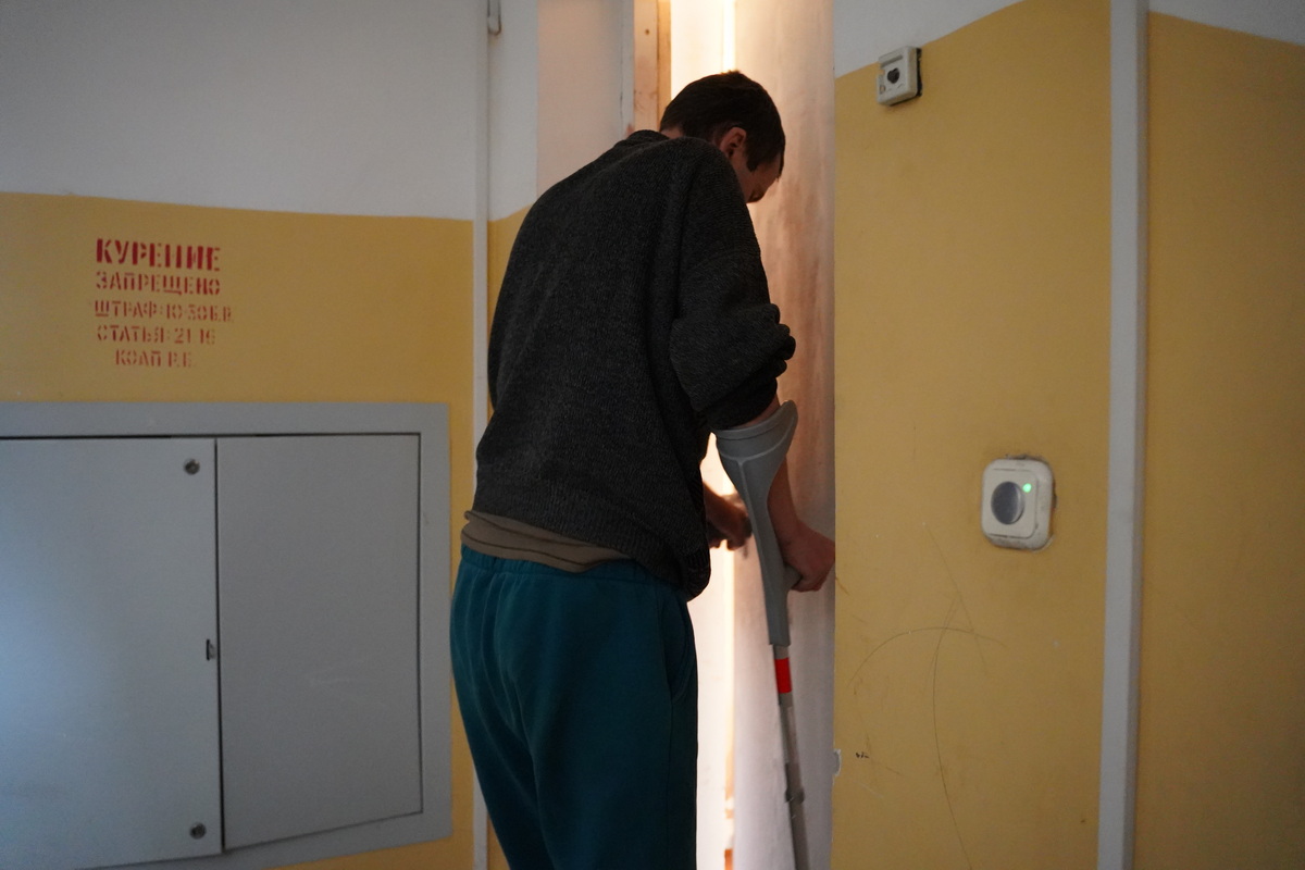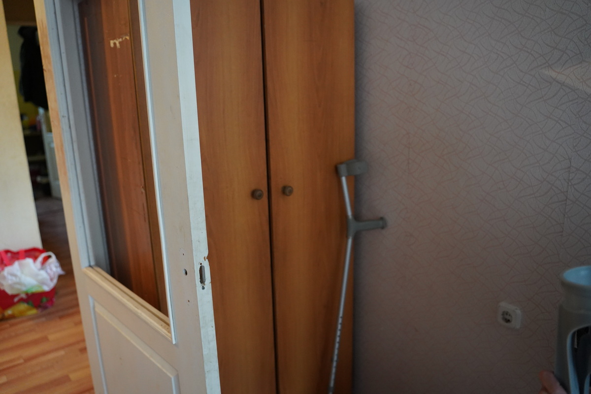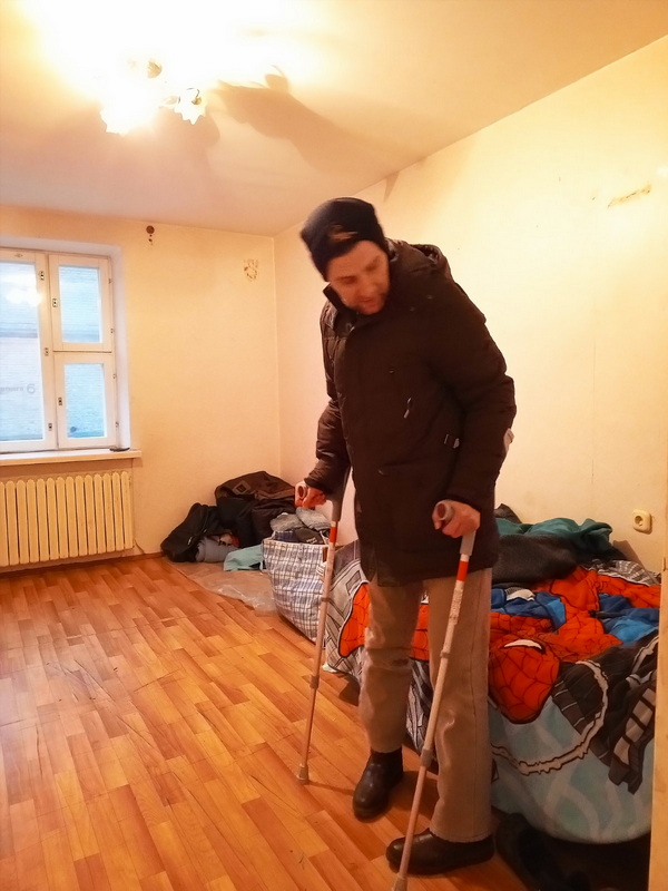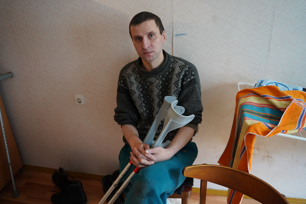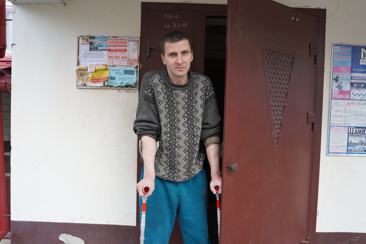 На днях gs.by побывал у Дмитрия. Он встретил нас у подъезда и, опираясь на костыли, поднялся в свою квартиру на первом этаже. В прихожей стоял таз с водой — видно, что он старался навести порядок.
