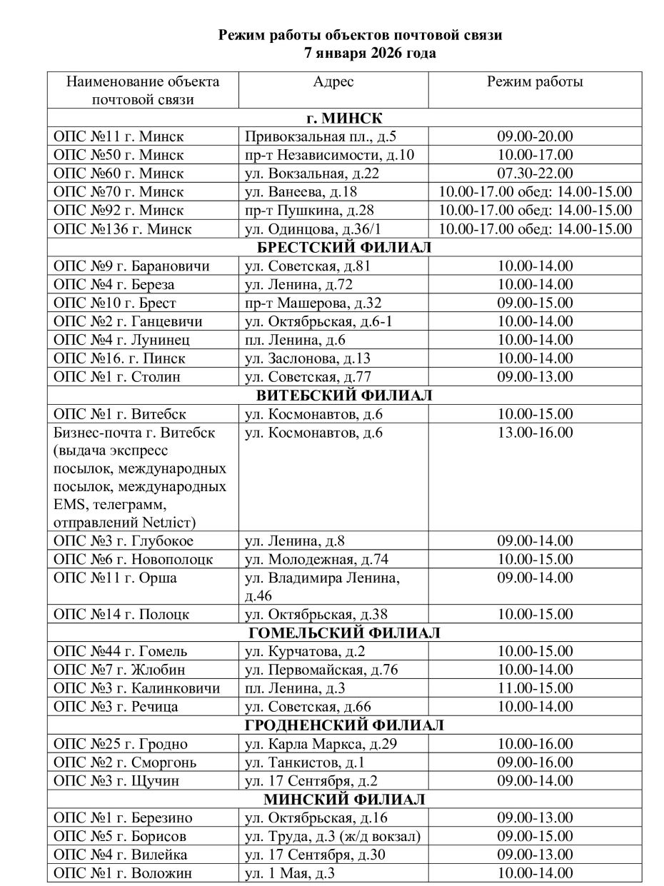 6 января 2026 года городские и сельские отделения почтовой связи работают по установленному режиму, рассказала пресс-служба "Белпочты".