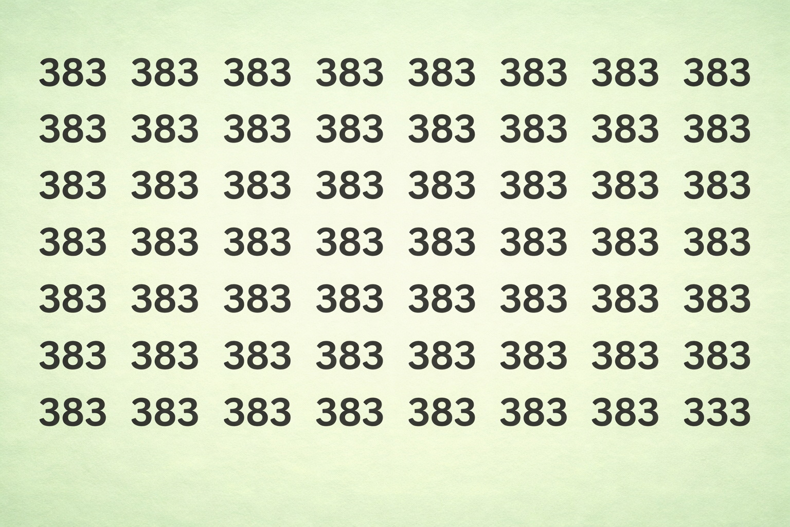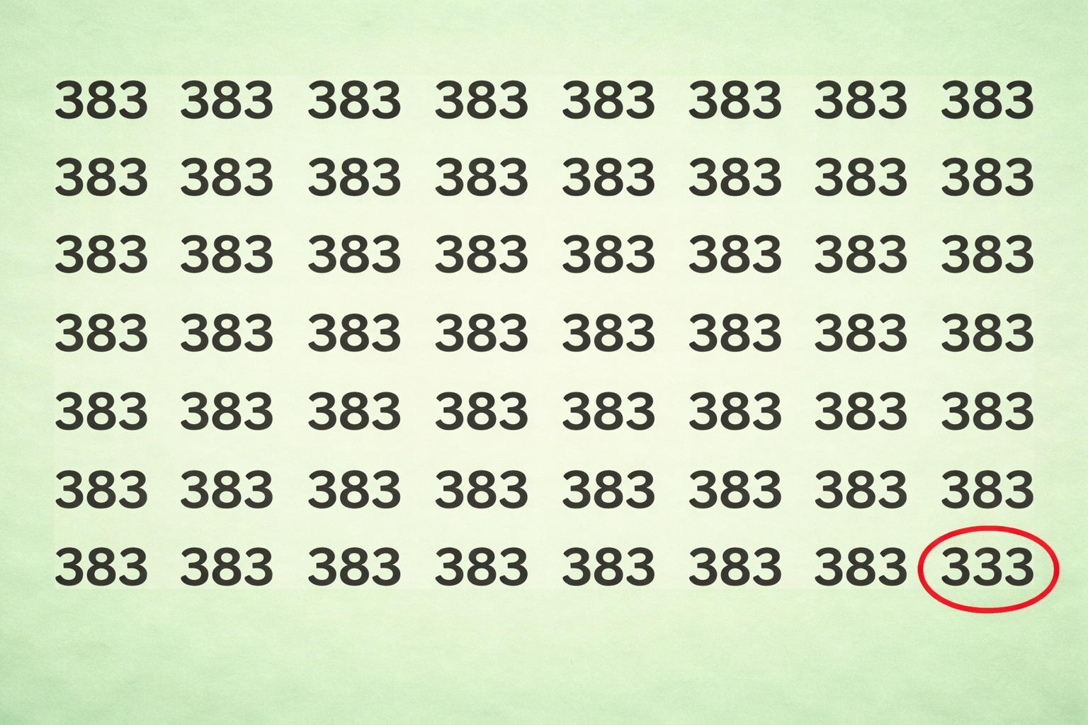 А теперь — новое испытание для вашей внимательности. Перед вами множество одинаковых на первый взгляд чисел 383. Среди них спрятано число 333. Сможете отыскать его всего за 5 секунд?