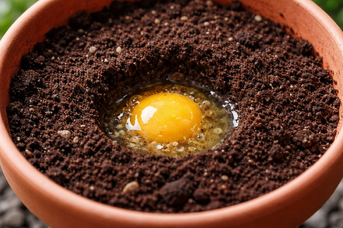 углубление. Вбейте туда сырое куриное яйцо и аккуратно размешайте его с почвой