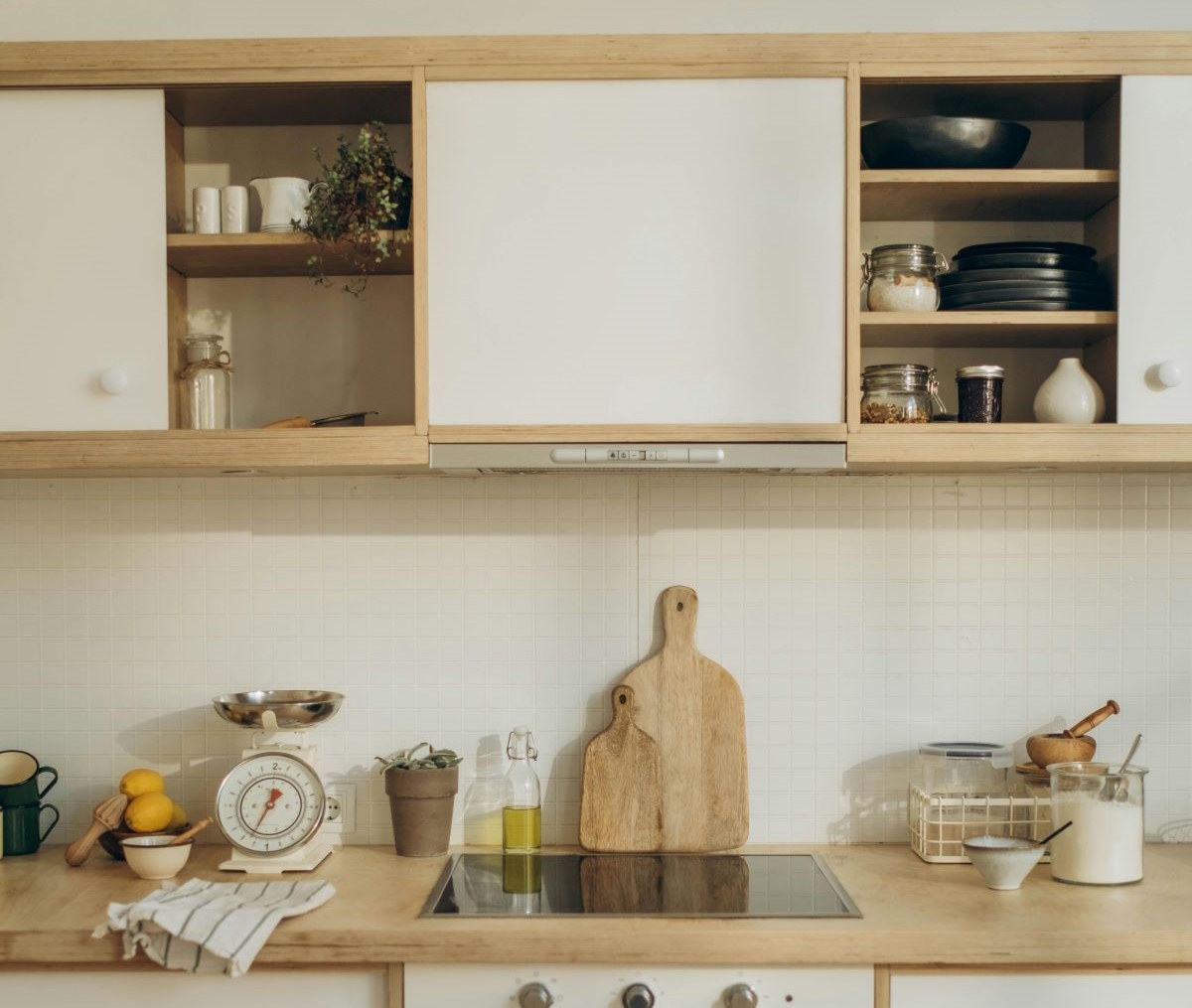Первый совет — снять дверцы с одного-двух верхних шкафов. Это бесплатно и мгновенно меняет восприятие кухни: уходит монотонность глухих фасадов, появляется место для красивой посуды, которая добавит интерьеру цвета и текстуры. При этом дизайнер предупреждает: не стоит открывать все шкафы сразу, иначе кухня может выглядеть захламлённой.