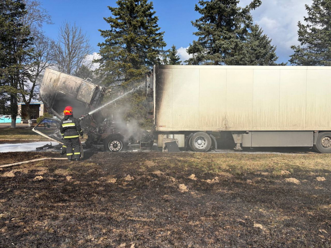 Подразделения МЧС оперативно прибыли к месту происшествия и ликвидировали горение. Огнем повреждена кабина и передняя часть прицепа, сообщает МЧС Гродно.