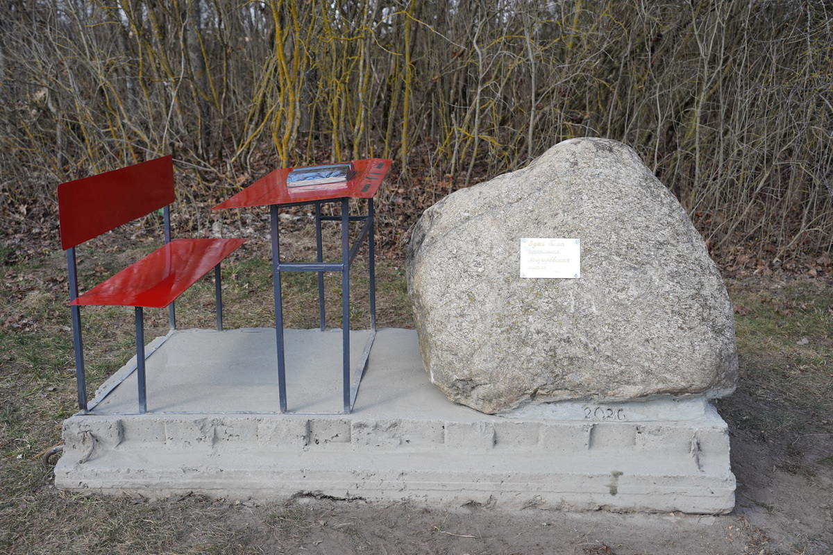 Сейчас на месте бывшей школы установлен памятный знак в виде красной парты, на которой лежат книга и ручка. На книге сделана надпись: