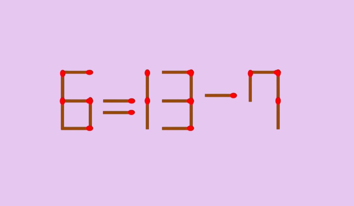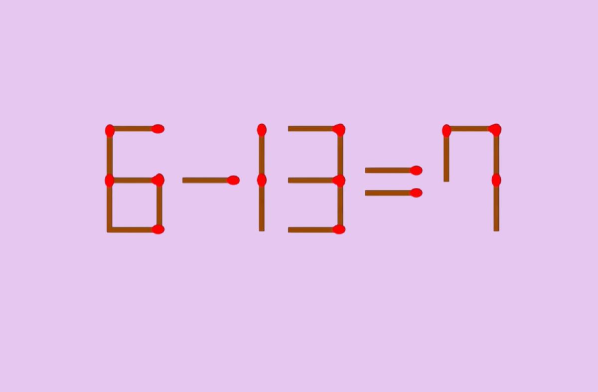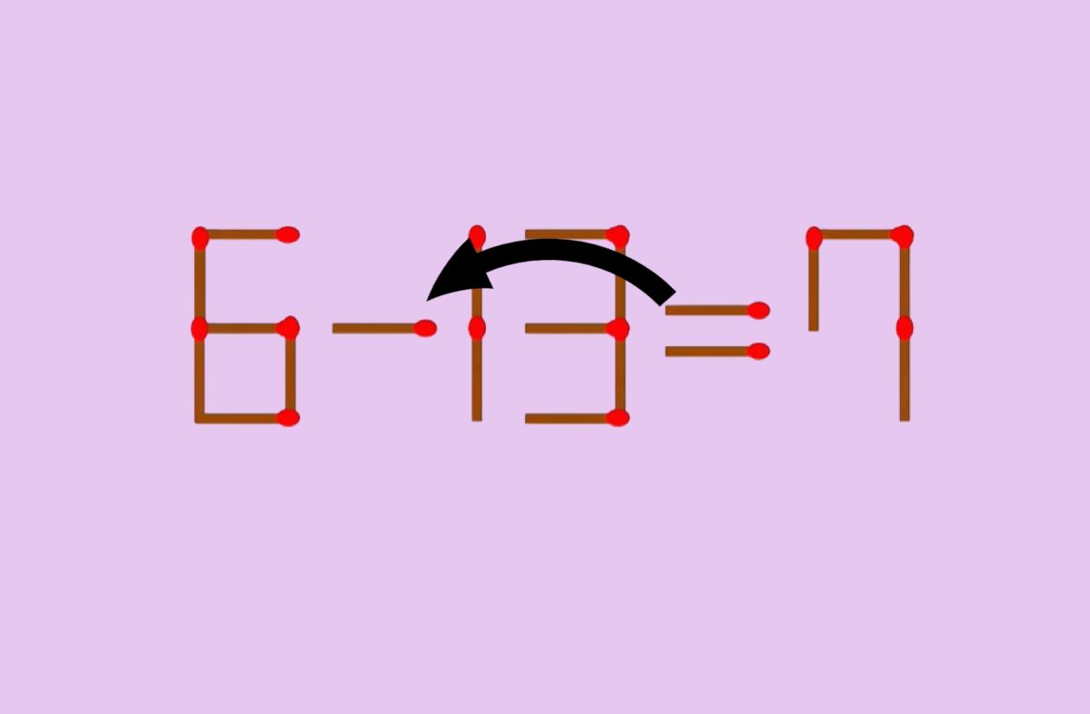 Очевидно, что равенство неверно: если от 6 отнять 13, результат будет отрицательным, а не 7. Задача участника — сделать уравнение верным, переместив только одну спичку. Менять местами цифры или ломать спички запрещено.