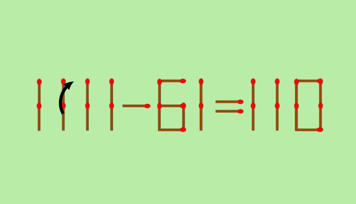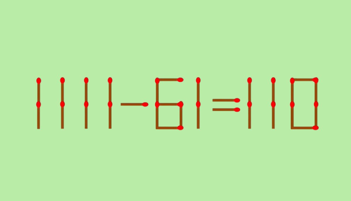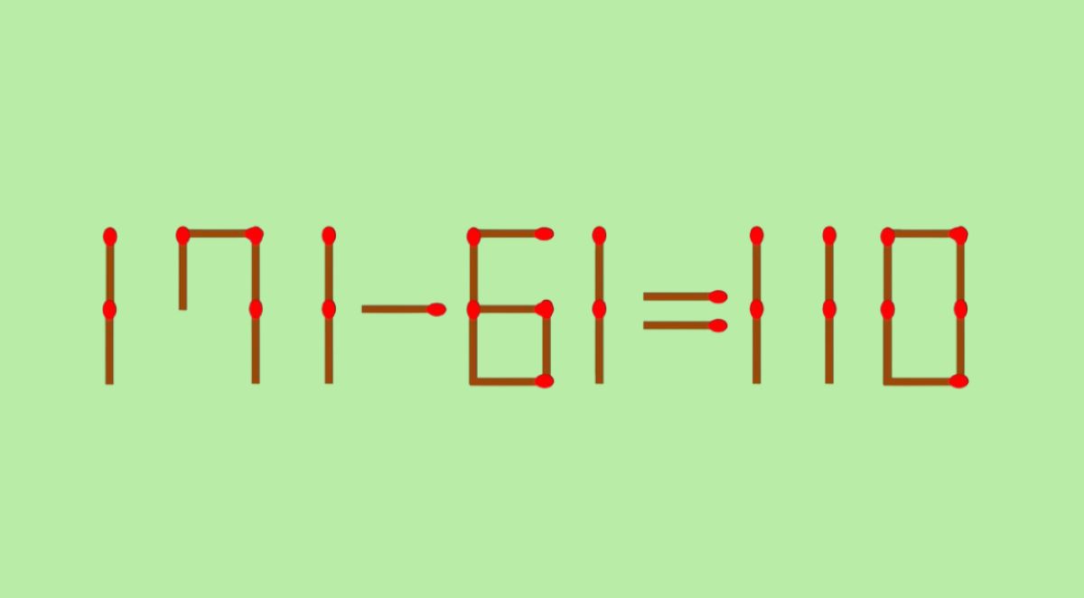 Чтобы получить верное равенство, возьмите одну спичку из второй цифры числа 1111 и положите её горизонтально сверху той же вертикальной палочки. Визуально «1» превратится в «7». Число 1111 станет 171, а уравнение приобретёт точный математический результат.
