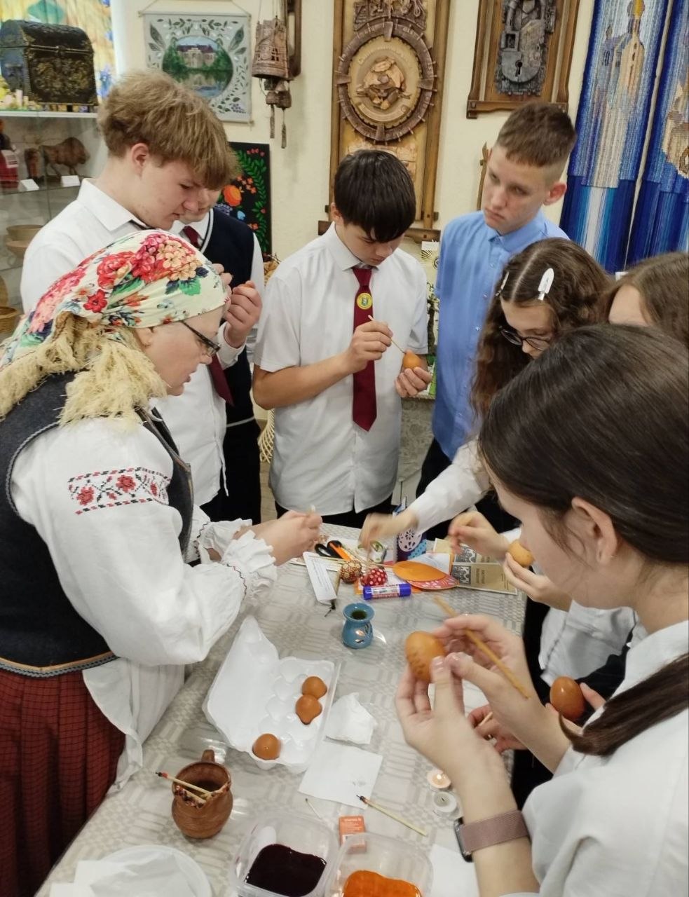 Для ўдзельнікаў мерапрыемства Алена Мікалаеўна правяла майстар-клас па пісанцы — старажытным мастацтве роспісу велікодных яек.