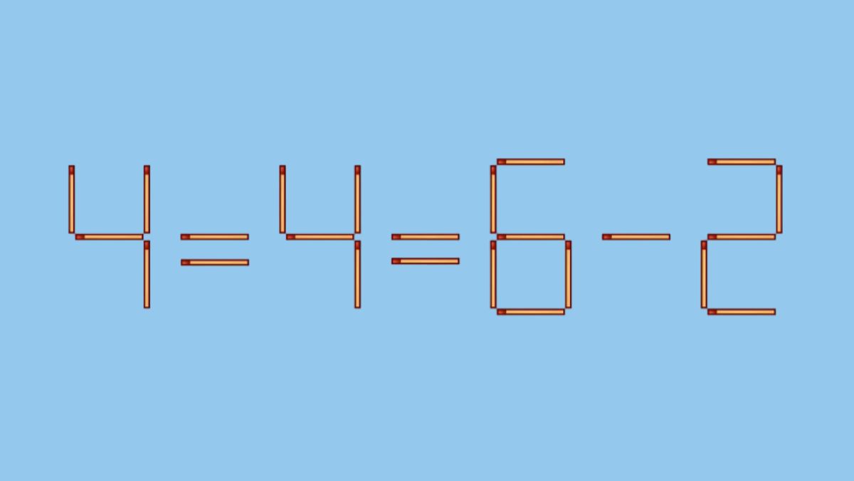 Это цепочка равенств: 4 = 4 и 4 = (6 – 2). Все три части выражения равны четырём. Равенство восстановлено!