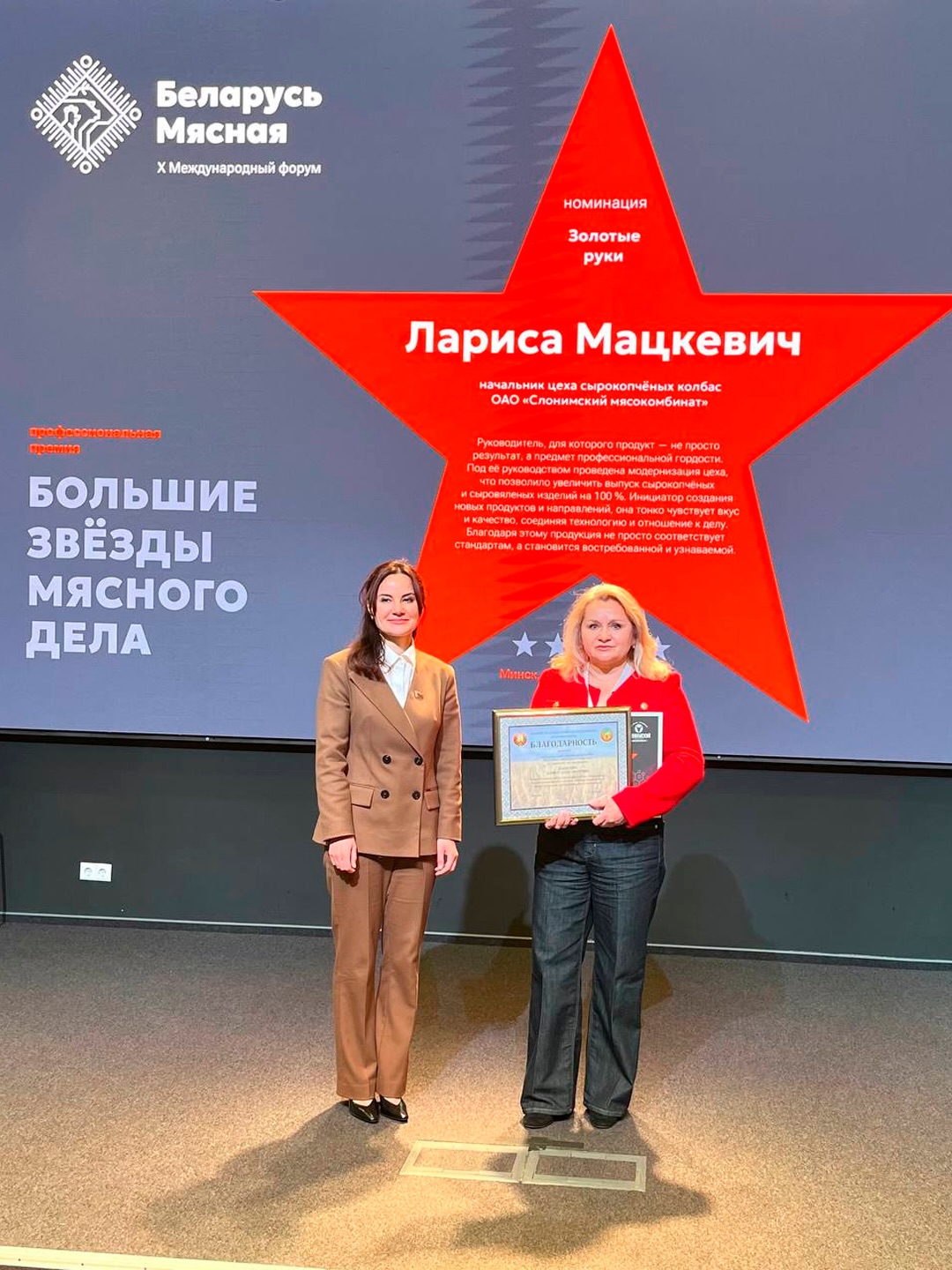 Особым событием форума стала церемония награждения профессиональной премии «Большие звёзды мясного дела». Лариса Мацкевич, начальник цеха сырокопчёных колбас ОАО «Слонимский мясокомбинат», была удостоена почётной награды «Золотые руки». Эта премия — признание высокого мастерства, многолетнего опыта и преданности своему делу.